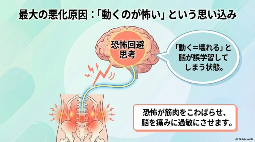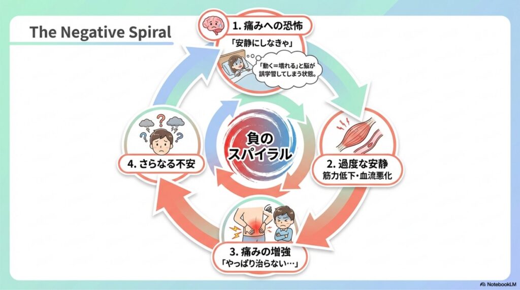 これは、一度強い痛みを感じた経験から、「動く=また痛くなる=身体が壊れる」と脳が強く学習してしまい、必要以上に安静にしてしまう状態です。