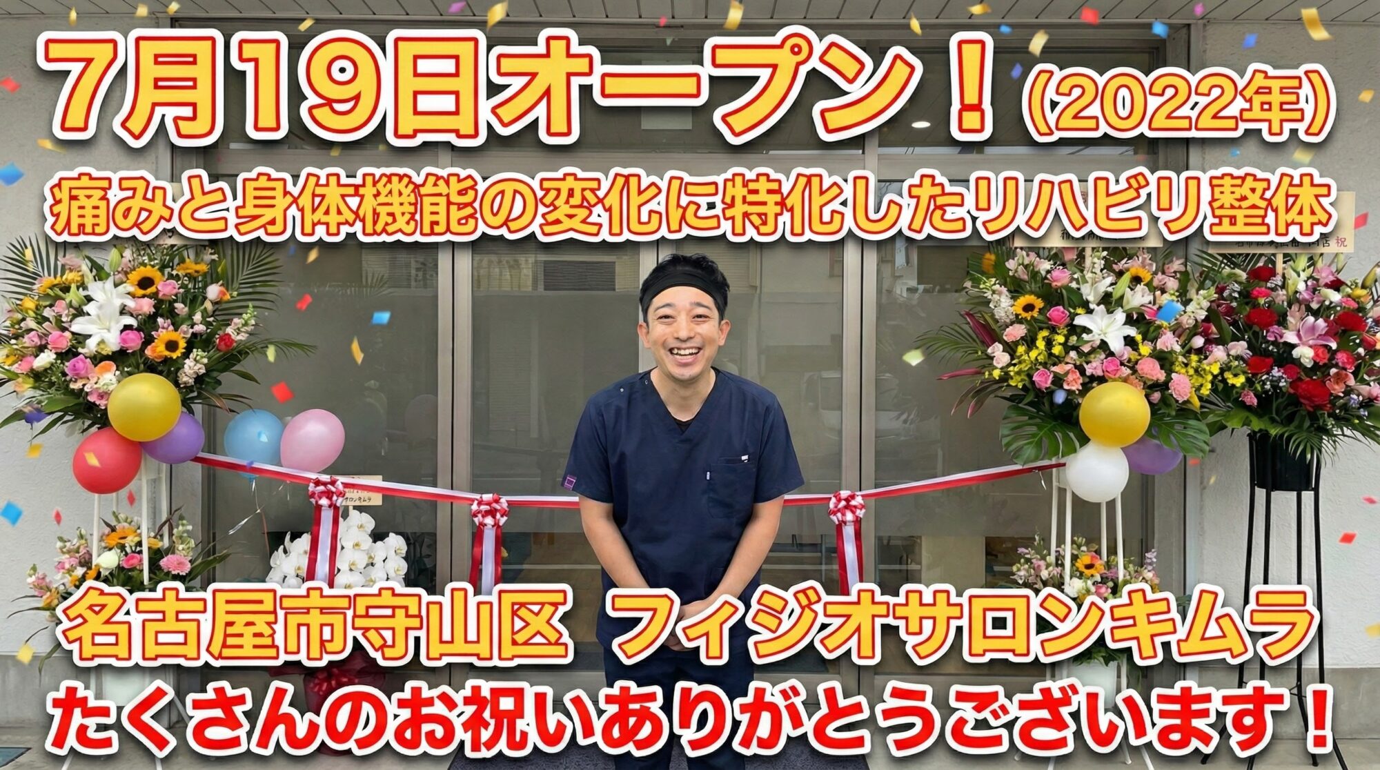 7月19日オープン(2022年) 2026 1/07 2026年1月7日 2022年7月19日、私の地元、守山区に痛みと身体機能の変化に特化したリハビリ整体をオープンしました。たくさんのお祝いをしていただき、本当にありがとうございます。 お役立ちコラム 当サロンからのお知らせ 7月19日オープン
