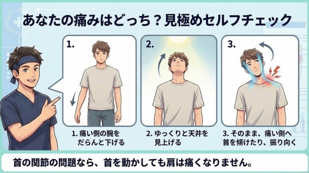 今あるその痛みが「五十肩」なのか「首由来」なのか、ご自身で簡易チェックを行ってみましょう。