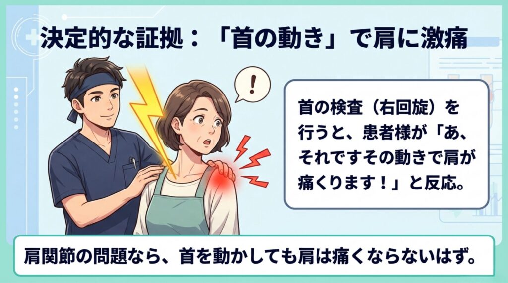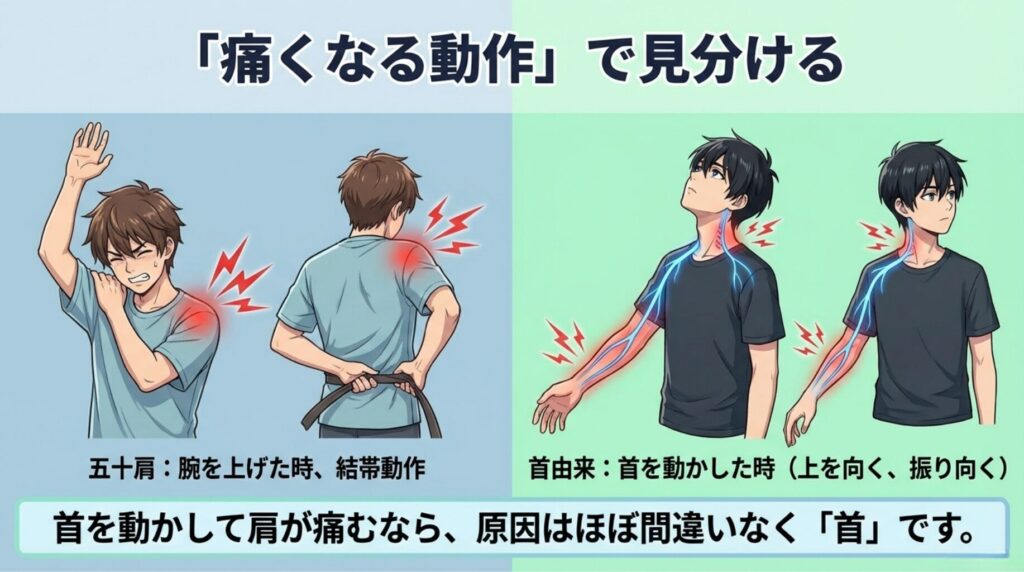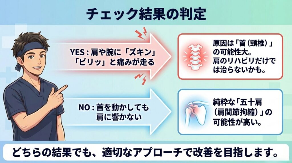 首を動かしても肩に響かないなら、純粋な「五十肩(肩関節拘縮)」の可能性が高いです。