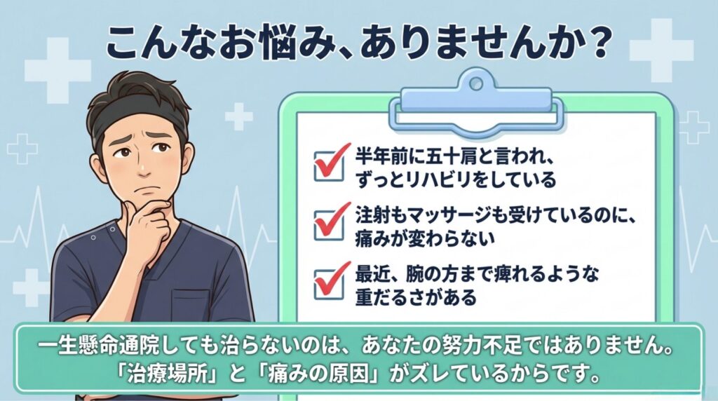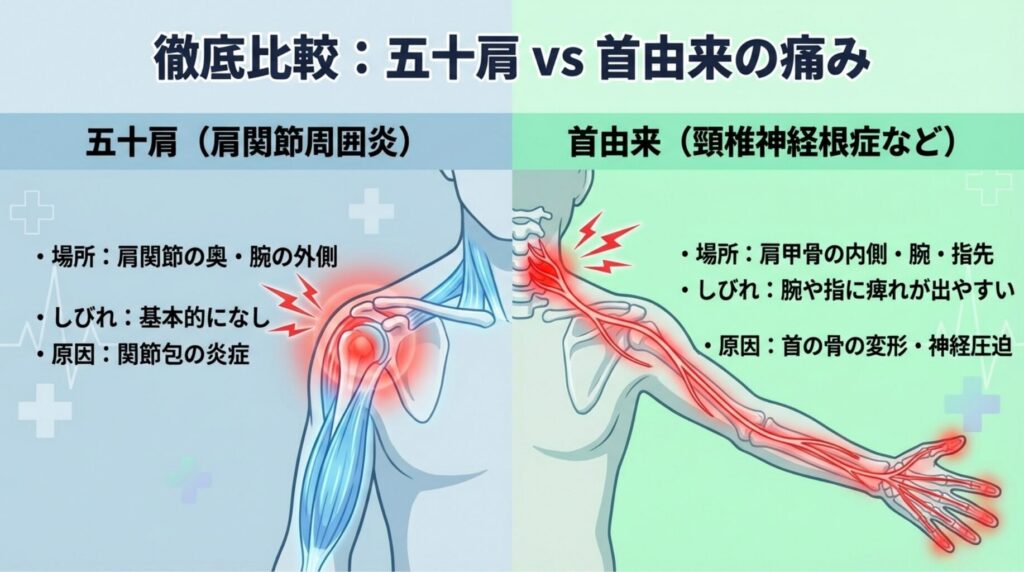 まずは、一般的な五十肩と、首が原因の痛みの違いを整理しましょう。ここを間違えると、治療期間が大幅に長引いてしまいます。