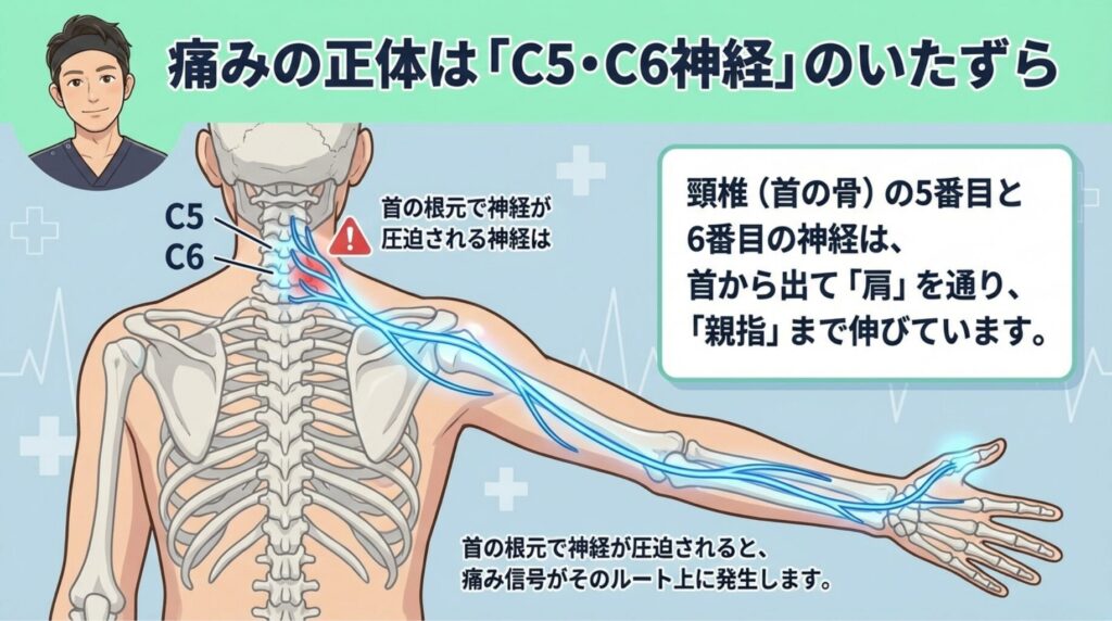 首の下の方にある「第5頸椎(C5)」や「第6頸椎(C6)」の神経は、首から出て肩を通り、腕の親指側まで伸びています。