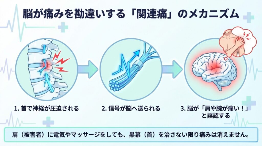 実際には肩の関節には何の異常もないのに、脳へ送られる電気信号が「肩の痛み」として誤認されてしまうのです。