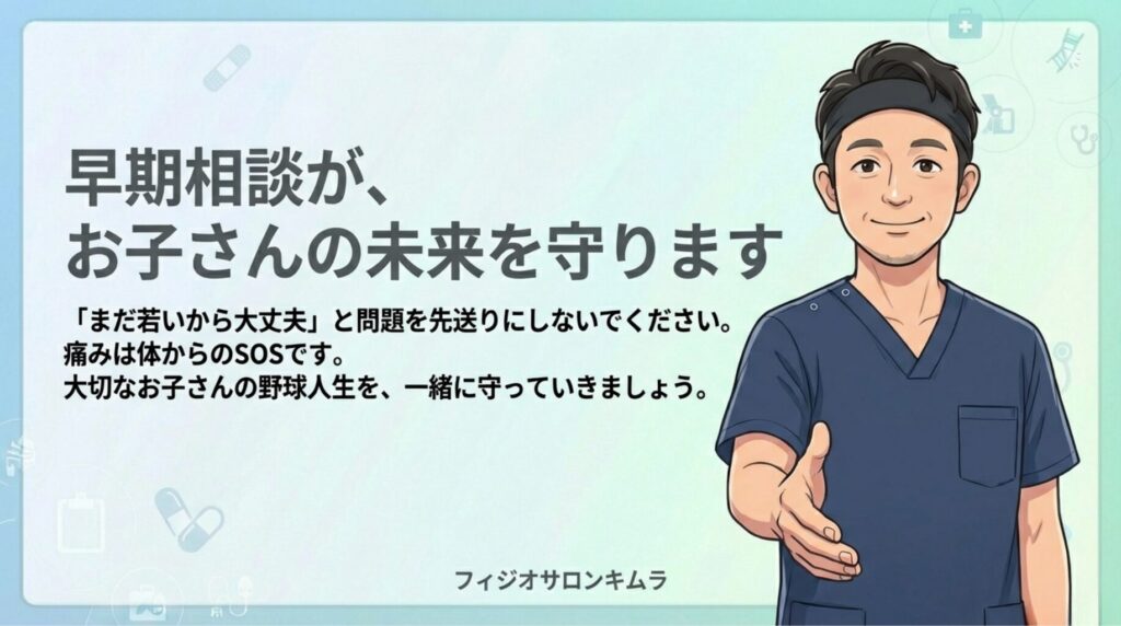 痛みは体からのSOSです。「おかしいな」と思ったら、放置せずに早めにスポーツ障害に詳しい専門家へご相談ください。大切なお子さんの野球人生を、一緒に守っていきましょう。