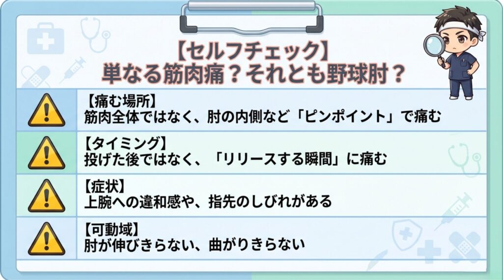 | チェック項目 | 単なる疲労・筋肉痛 | 野球肘(障害)の疑い |