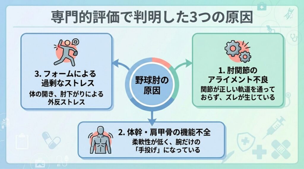 体が開きやすかったり、肘が下がったりすることで、肘の内側を無理やり引き伸ばす力(外反ストレス)が蓄積していました。
