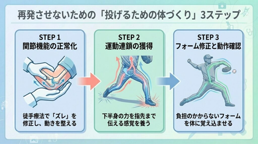 痛みを繰り返さないためには、以下のステップで「投げるための体づくり」を行う必要があります。