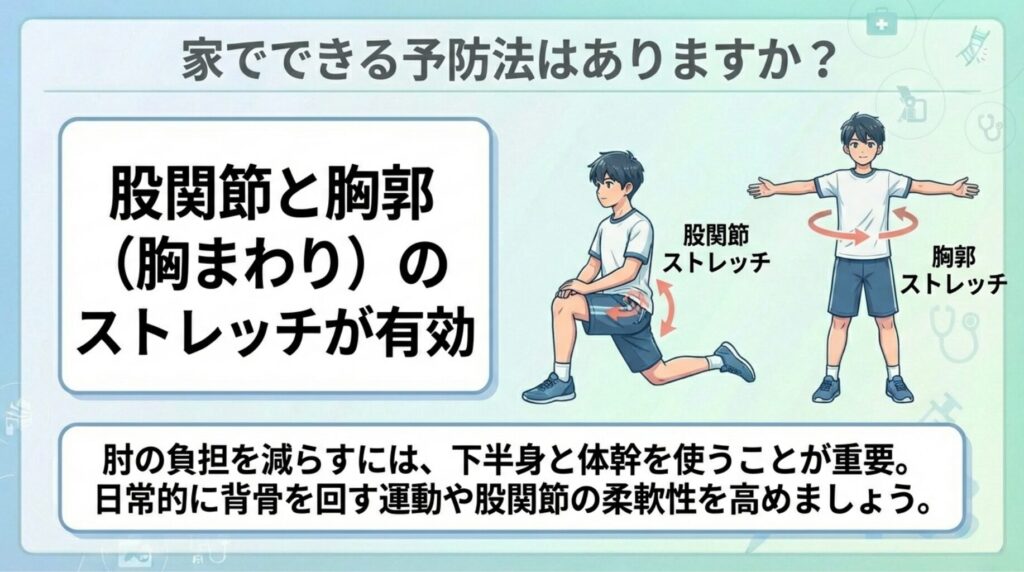 肘の負担を減らすには、下半身と体幹を使うことが重要です。股関節の柔軟性を高めるストレッチや、背骨を回す運動を日常的に行うことで、肘への負担を大幅に軽減できます。