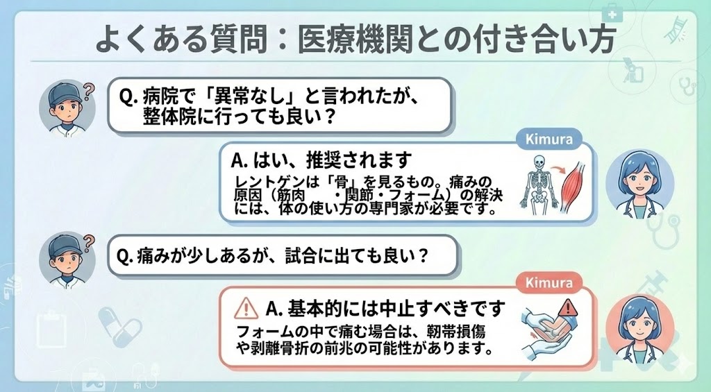 レントゲンは「骨」の状態を見るものですが、痛みの原因は筋肉、靭帯、関節の動き、フォームにあることが大半です。医療機関と連携しながら、体の使い方やバランスを整える専門家(理学療法士や柔道整復師など)に見てもらうことが根本解決への近道です。