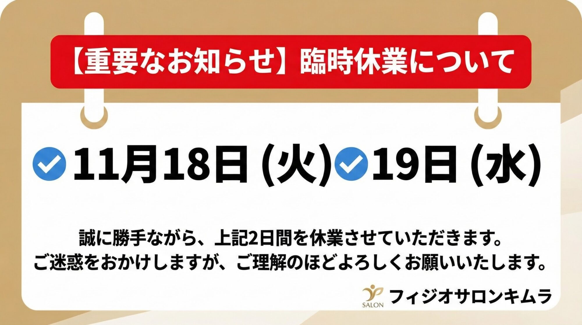 【臨時休業のお知らせ】 2026 1/07 2026年1月7日 いつもありがとうございます誠に勝手ながら、以下の2日間を臨時休業とさせていただきます。 🔹11月18日(火)🔹11月19日(水) ご迷惑をおかけしますが、ご理解のほどよろしくお願いいたします。 お役立ちコラム 当サロンからのお知らせ