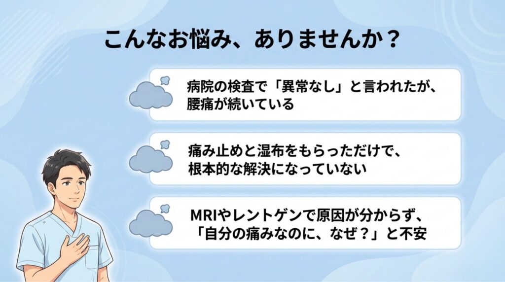 - 病院で「異常なし」と言われたが腰痛が続いている方
