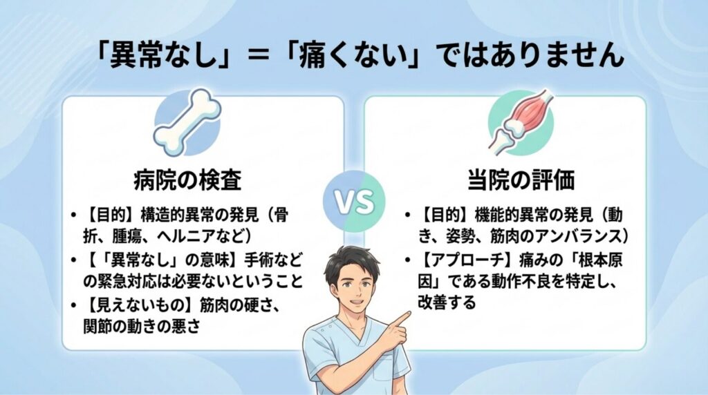 結論から言うと、病院の検査は「骨折やガンなどの構造的異常」を見つけるのが得意ですが、「筋肉の硬さや関節の動きの悪さ(機能的異常)」は見つけられません。「異常なし」とは「手術の必要はない」という意味であり、「痛くない」という意味ではないのです。