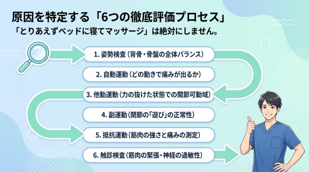 「とりあえずベッドに寝てマッサージ」はしません。当院では以下の6つの手順で、お身体の状態を徹底的に分析します。