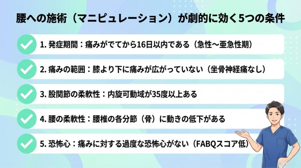 例えば、腰椎へのアプローチ(マニピュレーション)が劇的に効くタイプには、以下のような特徴があります。