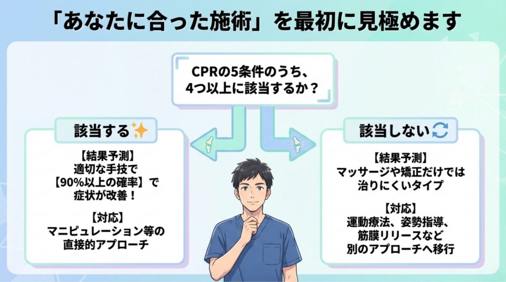 A. いいえ、そうではありません。CPRはあくまで「特定の手技(マニピュレーション)が効きやすいか」の判断基準です。当てはまらない場合は、体幹トレーニングや姿勢指導、筋膜リリースなど、別の有効な手段を選択して改善を目指します。