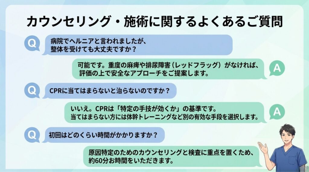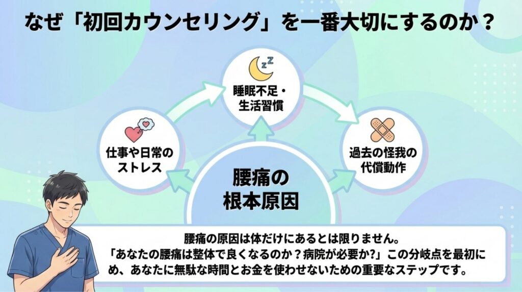 画像に映らない痛みの原因(姿勢のクセ、筋力低下、生活習慣など)を特定するためには、詳細なカウンセリングと身体評価が不可欠です。当院では、施術者の勘に頼るのではなく、医学的根拠に基づいた評価を行い、「あなたの腰痛に整体が有効か」を初回に明確に判断します。
