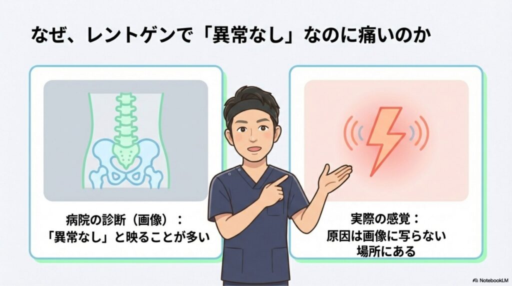 レントゲンやMRIで異常がないと、原因がないように思われますが、実際には