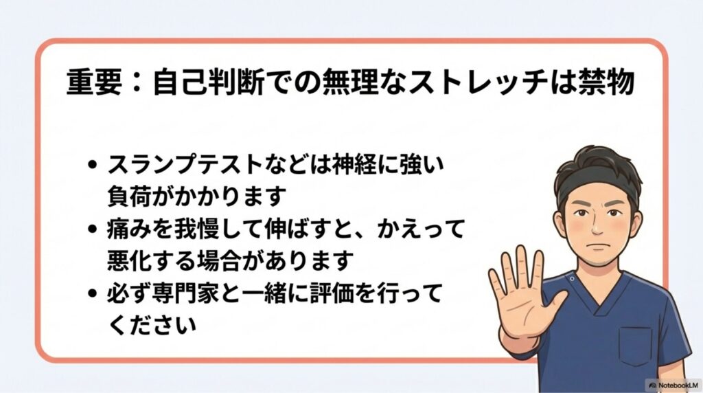自己流で強く伸ばしたり、痛みを我慢しながら行うと、かえって症状が悪化する場合があります。